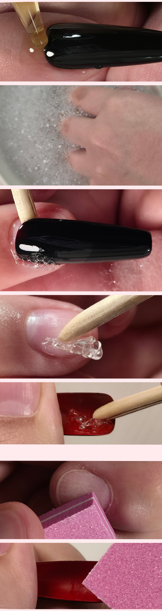 ***This process is faster if you soak in acetone instead, but you won't be able to reuse the press-ons, and it's much more damaging/drying to the nails and skin